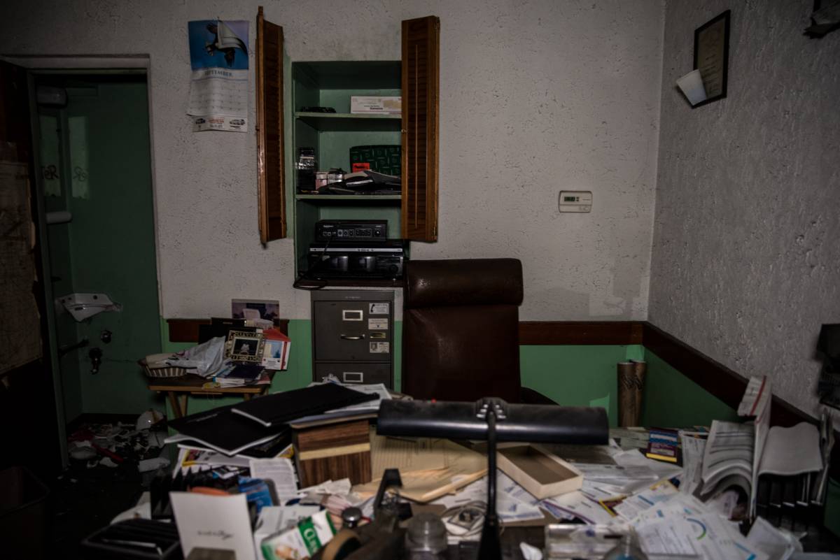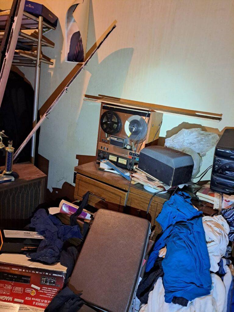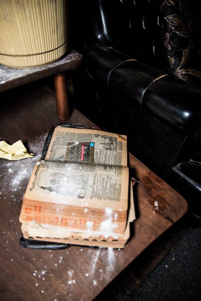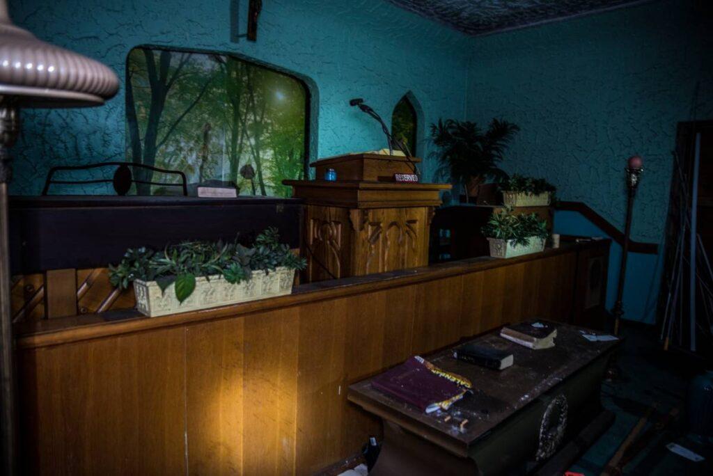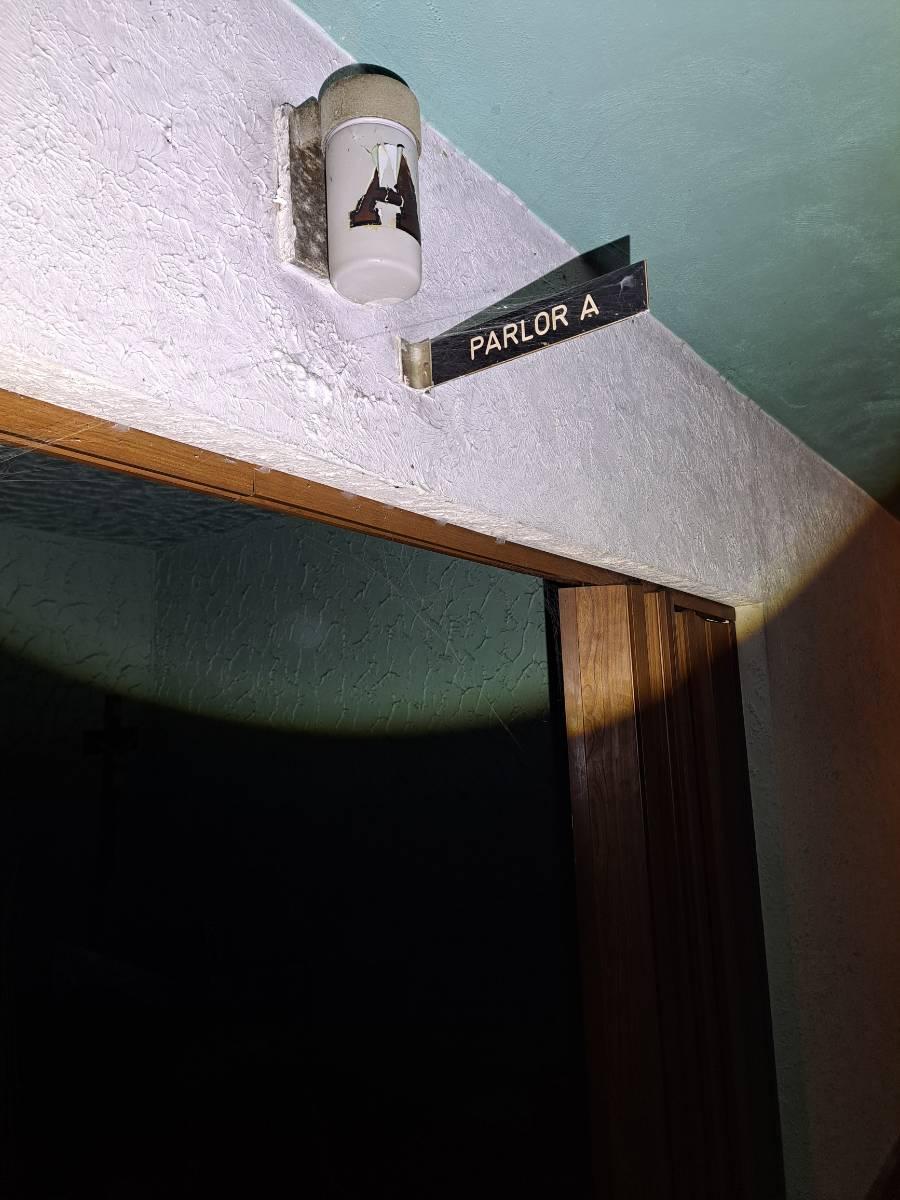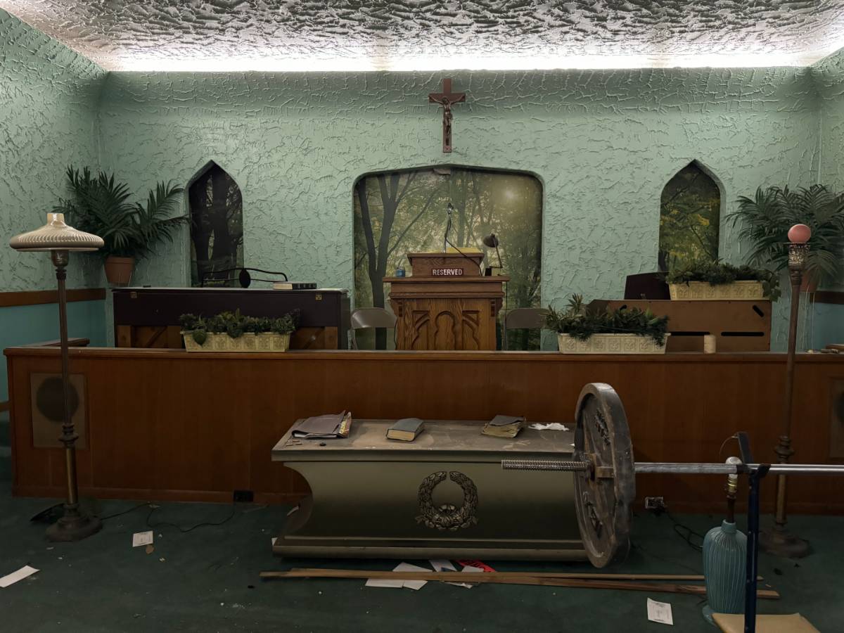 After documenting the body preparation area, we decided to roam further into the building. We passed what appeared to be two offices or maybe old bedrooms, and a kitchen down this main hallway. These rooms were all cluttered with shin deep trash and items just left to rot. In one room there was an old reel to reel recorder on a shelf. That recorder was giving me huge “Bio Shock- Audio Diaries” vibes! I was too afraid to give it a listen. I’ve been ambushed too many times like this before. (Maybe after our next save point). There were also countless bags full of old discarded lottery tickets littering the hallway leading to the main viewing parlor. Before entering the main viewing parlor, we stumbled past 3 or 4 smaller side parlors. Each of those too, was left in disarray and surprisingly filled with clutter.