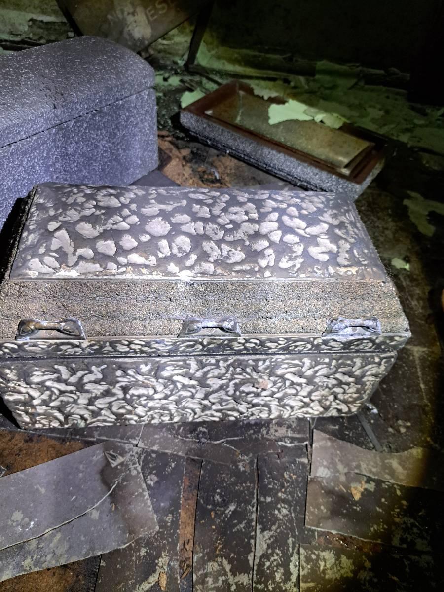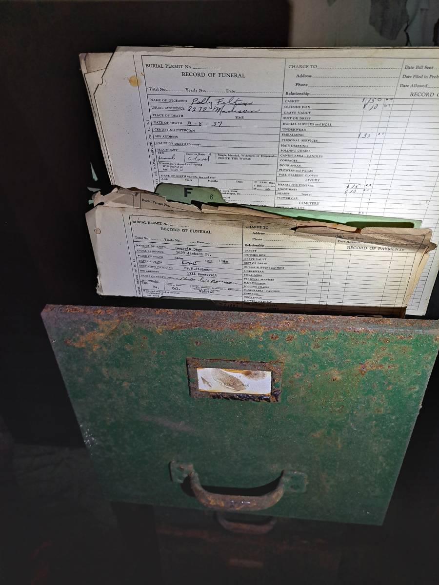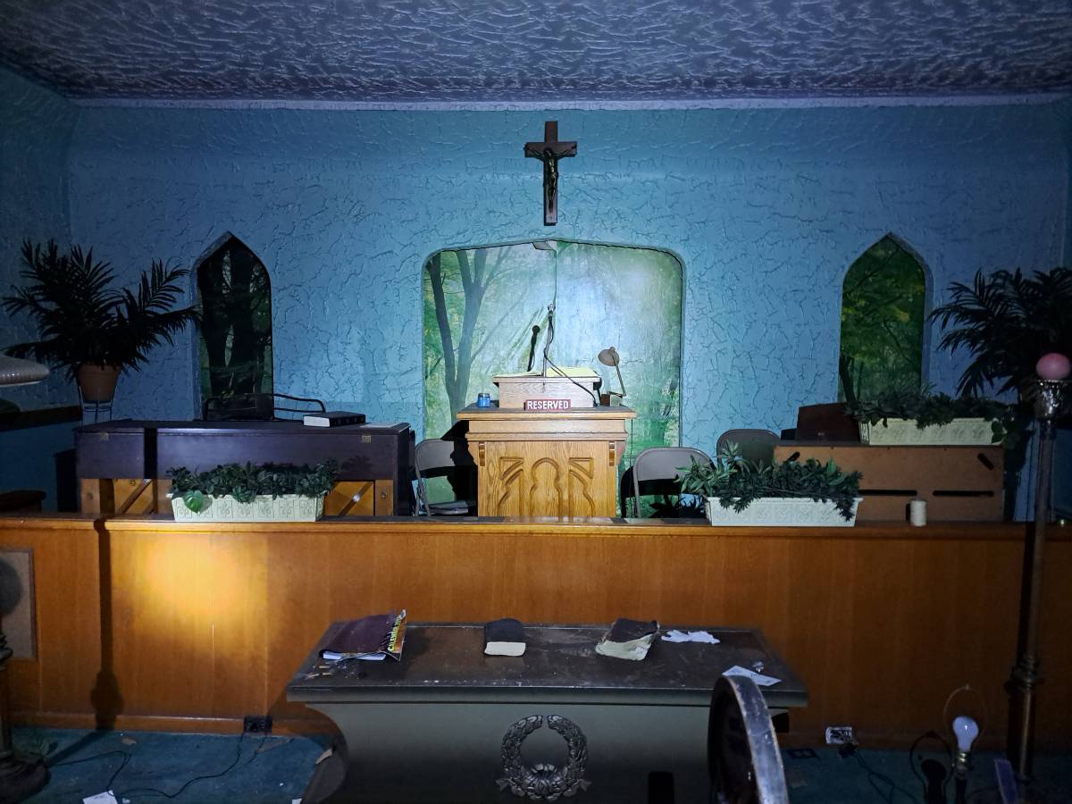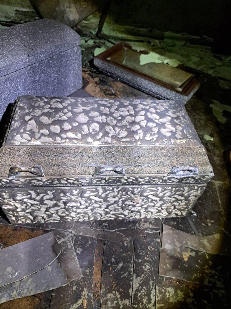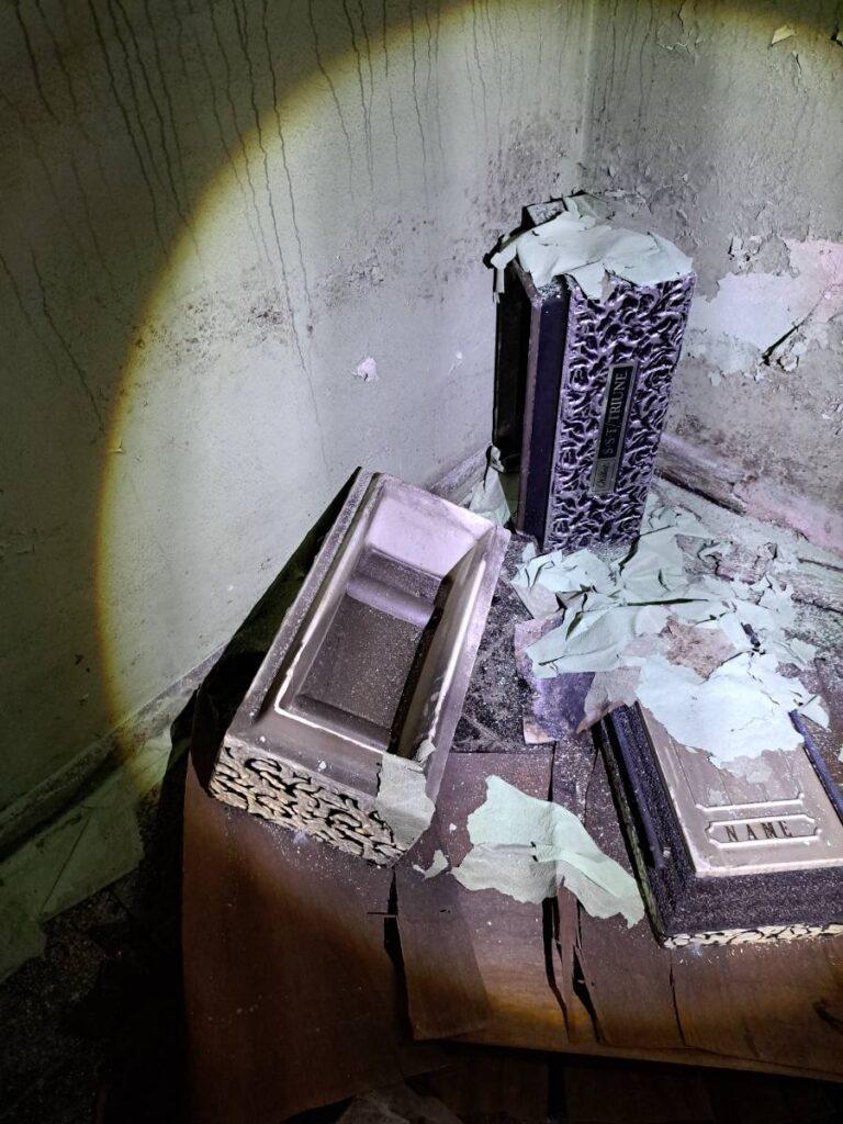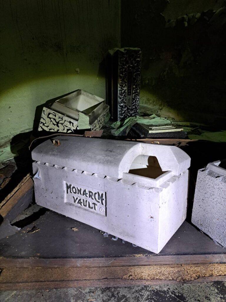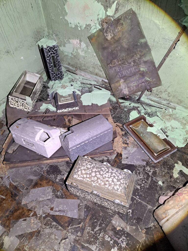 Initial few feet in the door felt unrealI had a high school friend who was going to study restorative artsThis is an embalming pump/machine, and it does all the nasty hard work.. I was saddened I didn’t try this wig on.. Till next time, friends….Body coolers – not so cool on a 90 degree daykitchen now so cluttered with everything, you couldn’t move the door anymore open or closed.playing a ton of video games… I half thought we would find our next clue or piece of backstory on that reel to reelsuch an eerie environment normally. Yet, with just us 2(hopefully) quietly roaming here, it made it somehow worse. Every sound we thought we didn’t make was amplifiedPiles of old albums, kites, and funeral flags lay everywhere. The vinyl came in both 7″ and 12″ styles!Stacks of funeral programs, pamphlets, and brochures. Selling everything from caskets and plots of land, to your salvation and lasting memory.“side” visitation rooms. The smaller rooms that can be divided for multiple viewings. Now just more cluttered storageThis was the majority of the neglect.. piles of old paperwork strewn about… A staggering amount of this is “scratch-off” & “powerball”/”megamillions” style lottery ticketsnot a ton a tags or b.s., just clutter and paperwork in most places..This bathroom though! I’d take this stylin bathroom remodel in my home. I picture a lady mortician or Funeral director enjoying a smoke in that chair. Relaxing a bit, while she finishes her make-up, before that day’s long work.10/10 as far as cozy bathrooms go! In an abandoned apartment, above and abandoned funeral home, was this clean time capsule of a bathroom.piles and piles of various gurneys for moving the deceasedname plates that weren’t picked up and used?? maybe they were misspelled or had incorrect info – dates, etcpaperwork from the late 30s early 40syes that is a small casketsadly, tucked away in the basement there was a small wall full of children’s casketsMore metal gurneys and caskets on wheels – burial vaults maybe??Two children’s caskets/vaults lay at odd angles, tossed next to an unused bo-flex and piles of clutter and detritusMaybe it closed because of a gambling issue?? or the vagrant that stays here is “hoping to hit it big” – Literally hundreds/thousands?? maybe>>>? of printed lotto tickets. Numerous bags full of them. 3 bags just in this pic.-or a scam maybe??I completely missed the tools on our initial pass through this room.. That IS Not blood on the wall as other explorers have alluded toThink of all that these containers have “seen”. This cabinet has been here, witness to so much, for so many decades…. ..I love the accidental shot <3I would find out weeks later just how REAL that that pony-tail is.