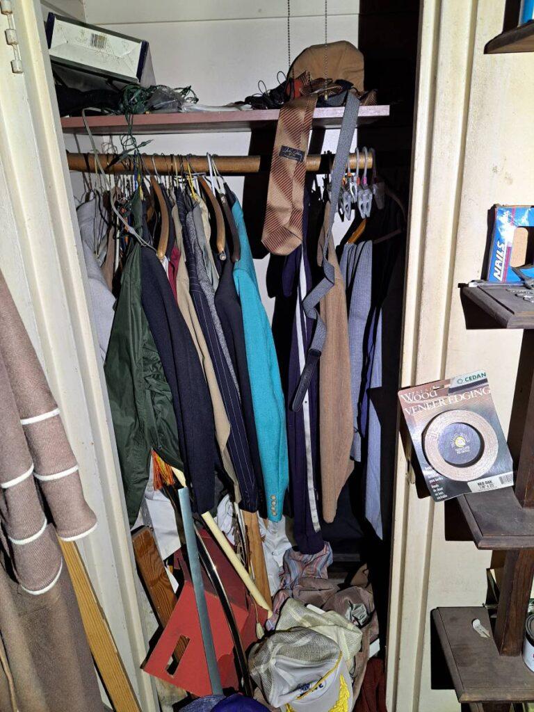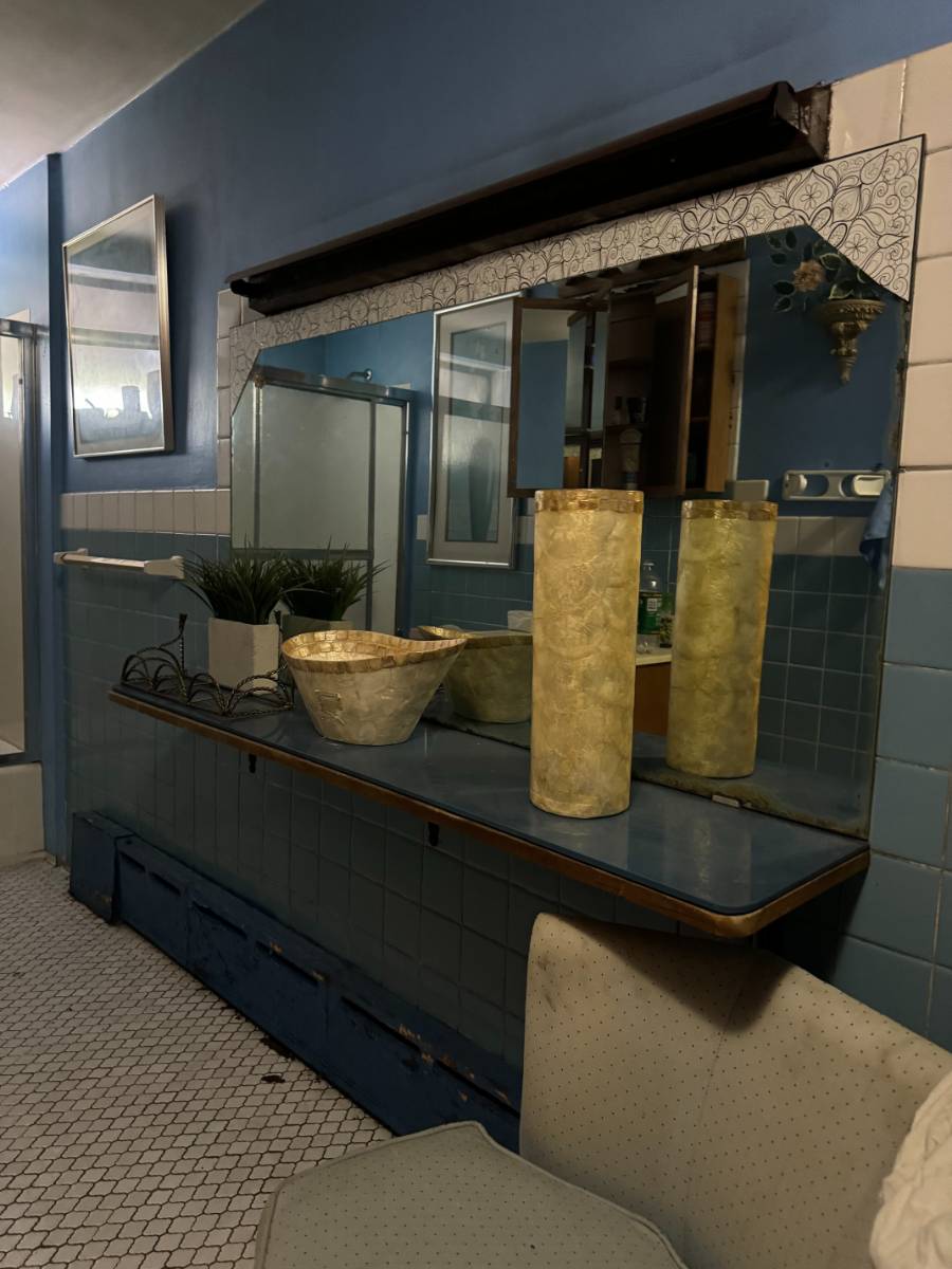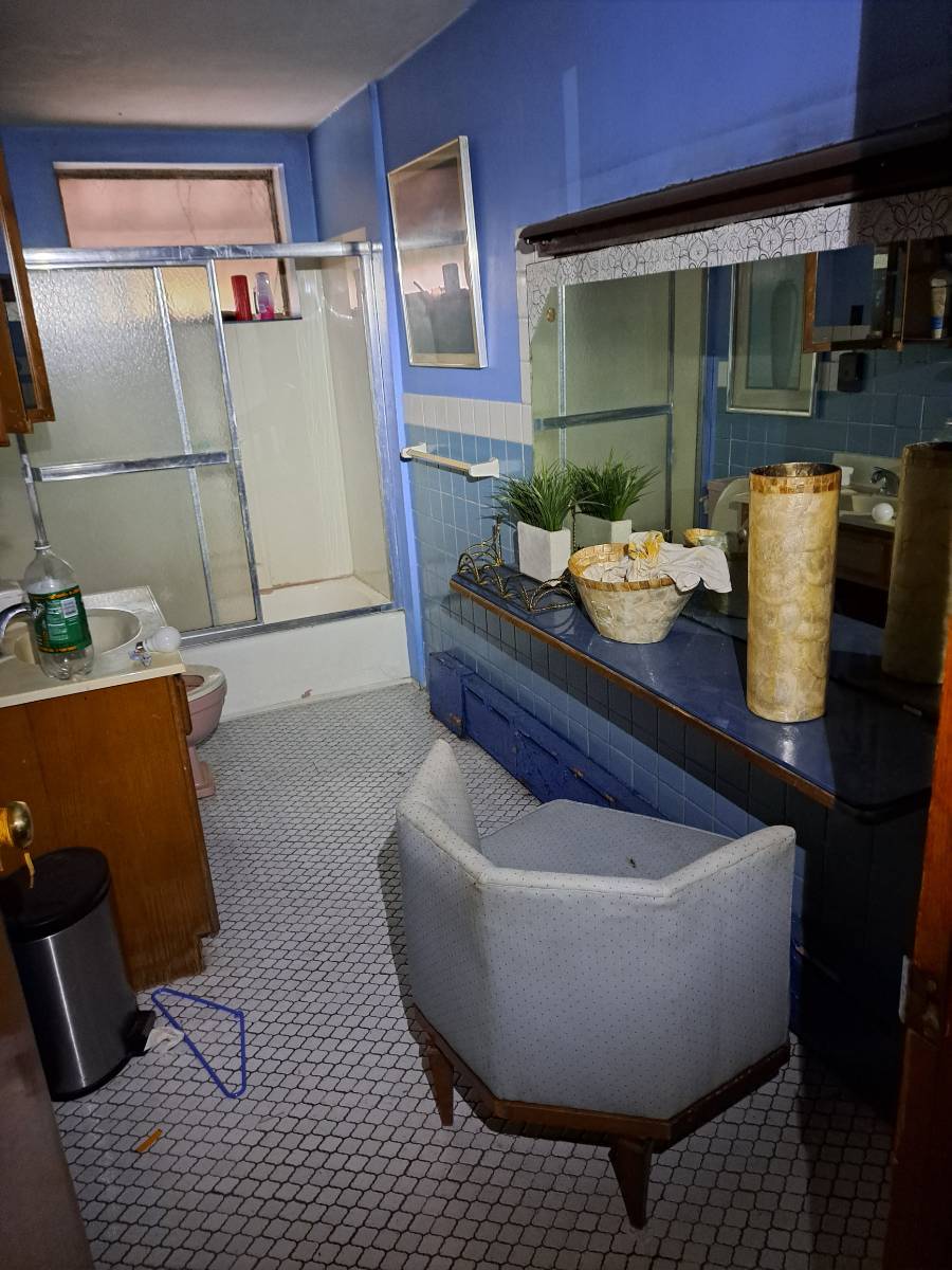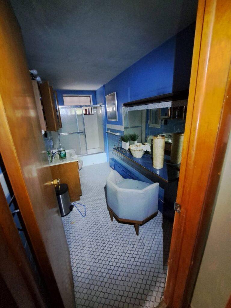 Once we cleared the main parlor and office, we passed through the entryway(all extremely cluttered), and headed for the upstairs apartment. “This cozy and inviting second story, two bedroom apartment is situated walking distance away from… .. ..” Sorry the ad almost writes itself! Seriously though, this place was hands down nicer than my first few apartments. It was still relatively “move in ready”, with most major furnishings and a semi-dated bathroom remodel, I still think is pretty sweet. Even if they are a bit dated; that countertop, blue tile, and mirror are things I could live with!