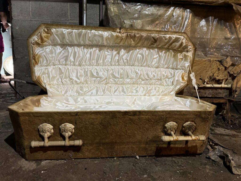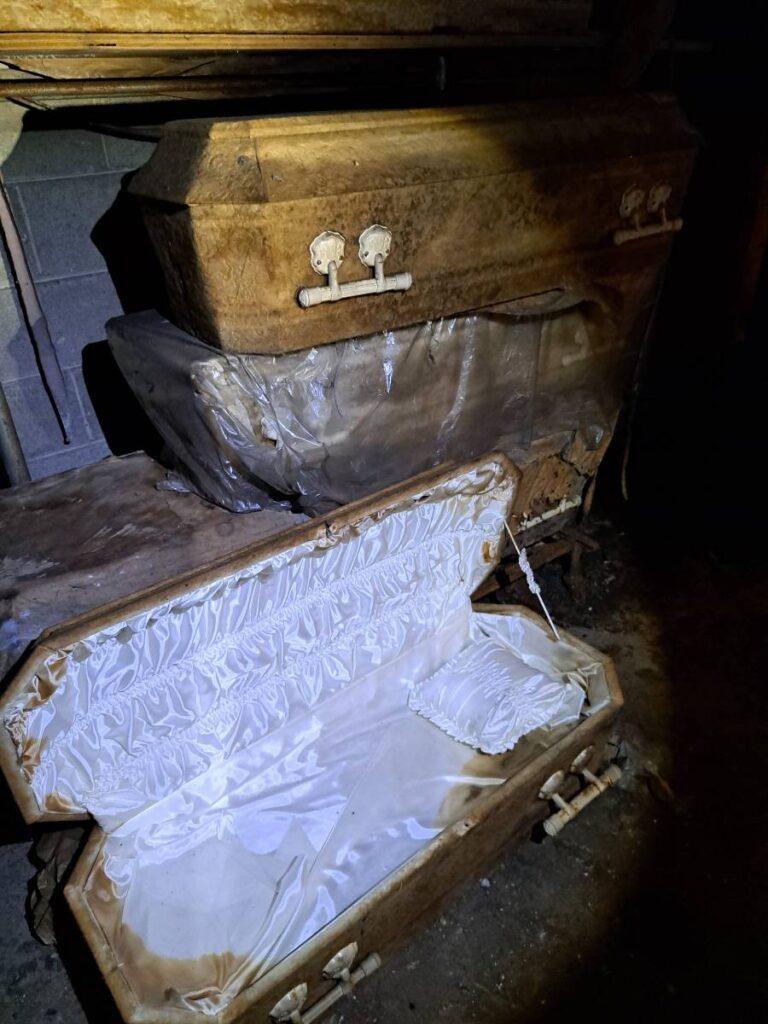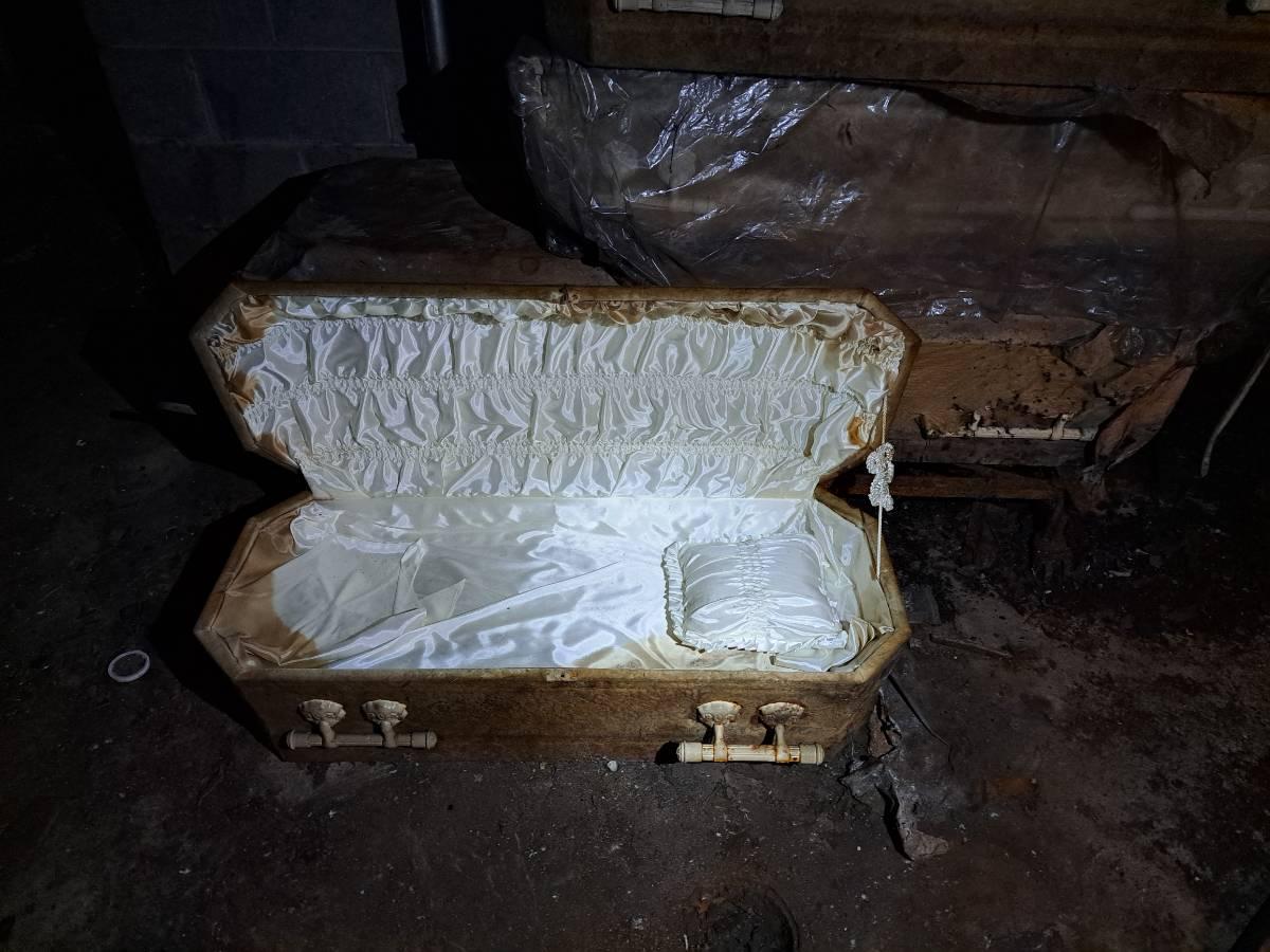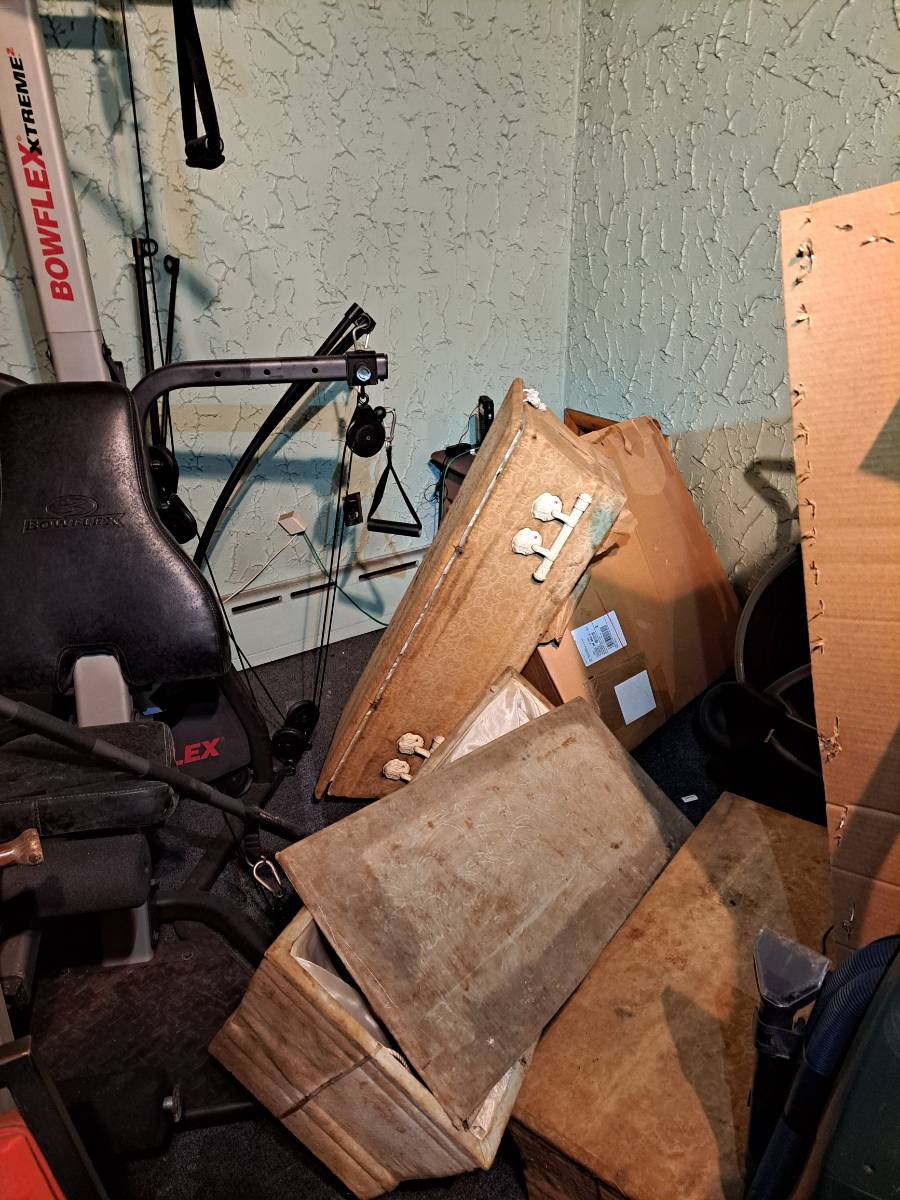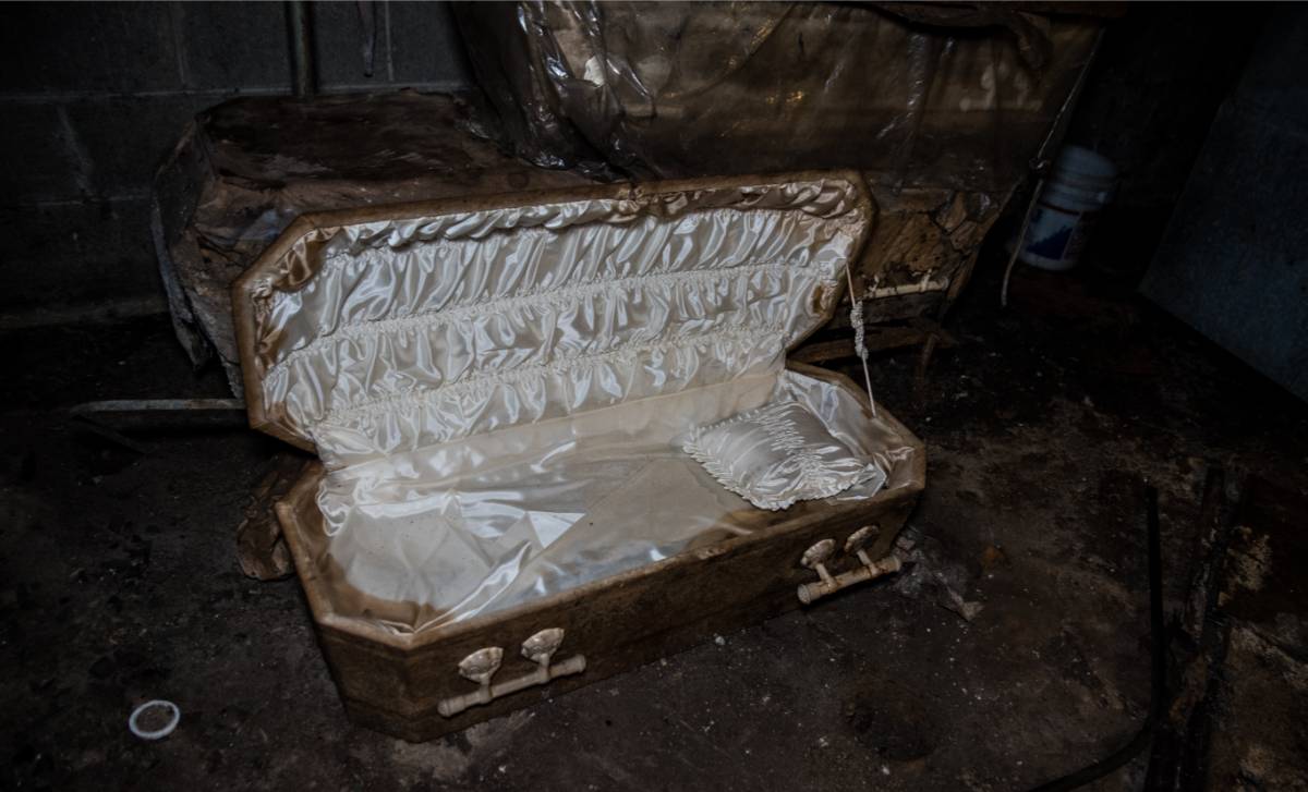 a child’s casket just tossed next to an unused bo-flex and piles of clutter and detritus