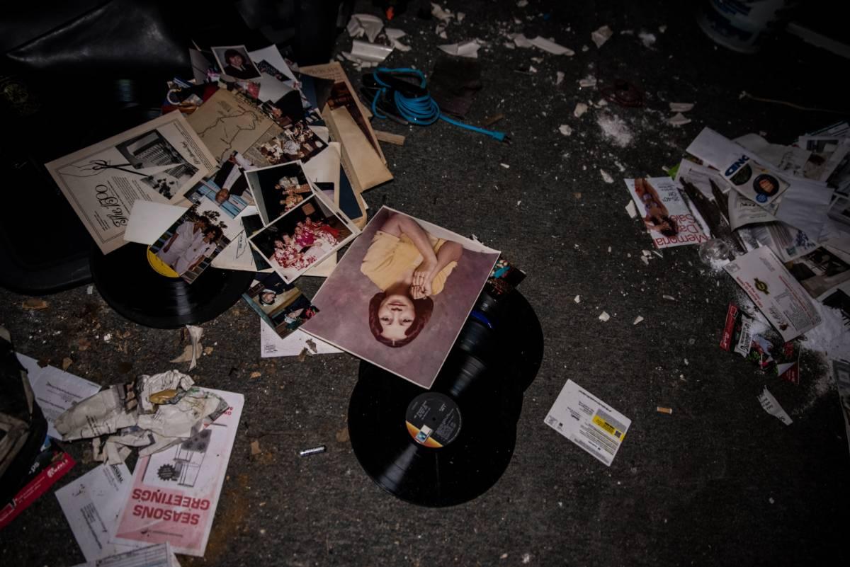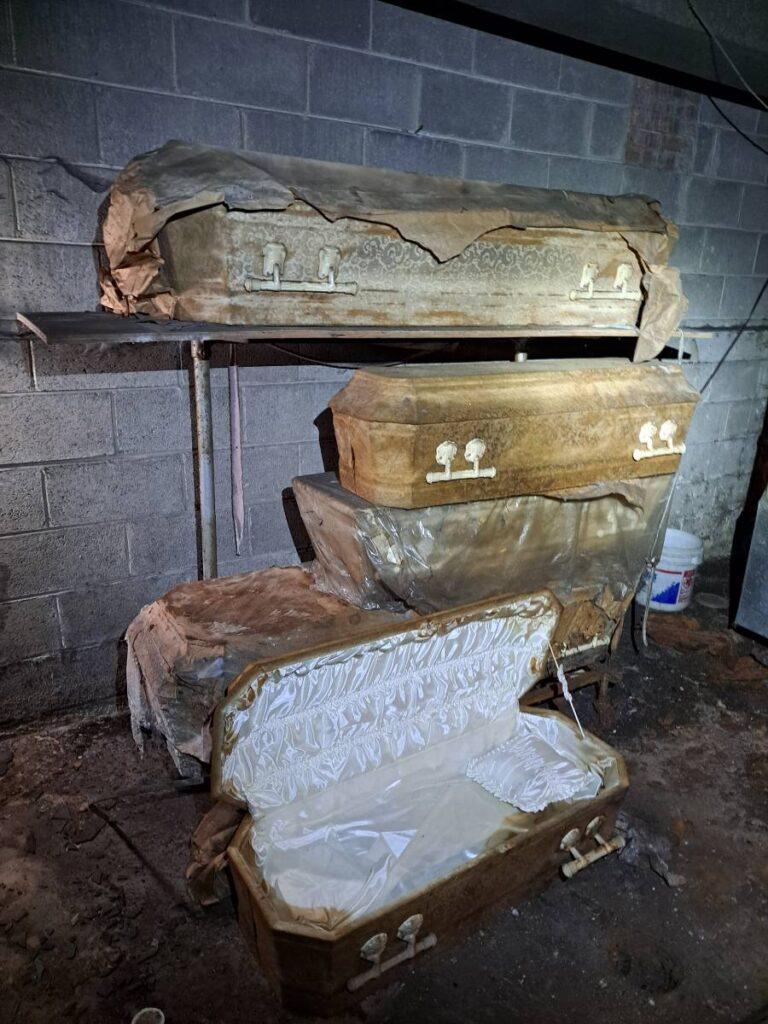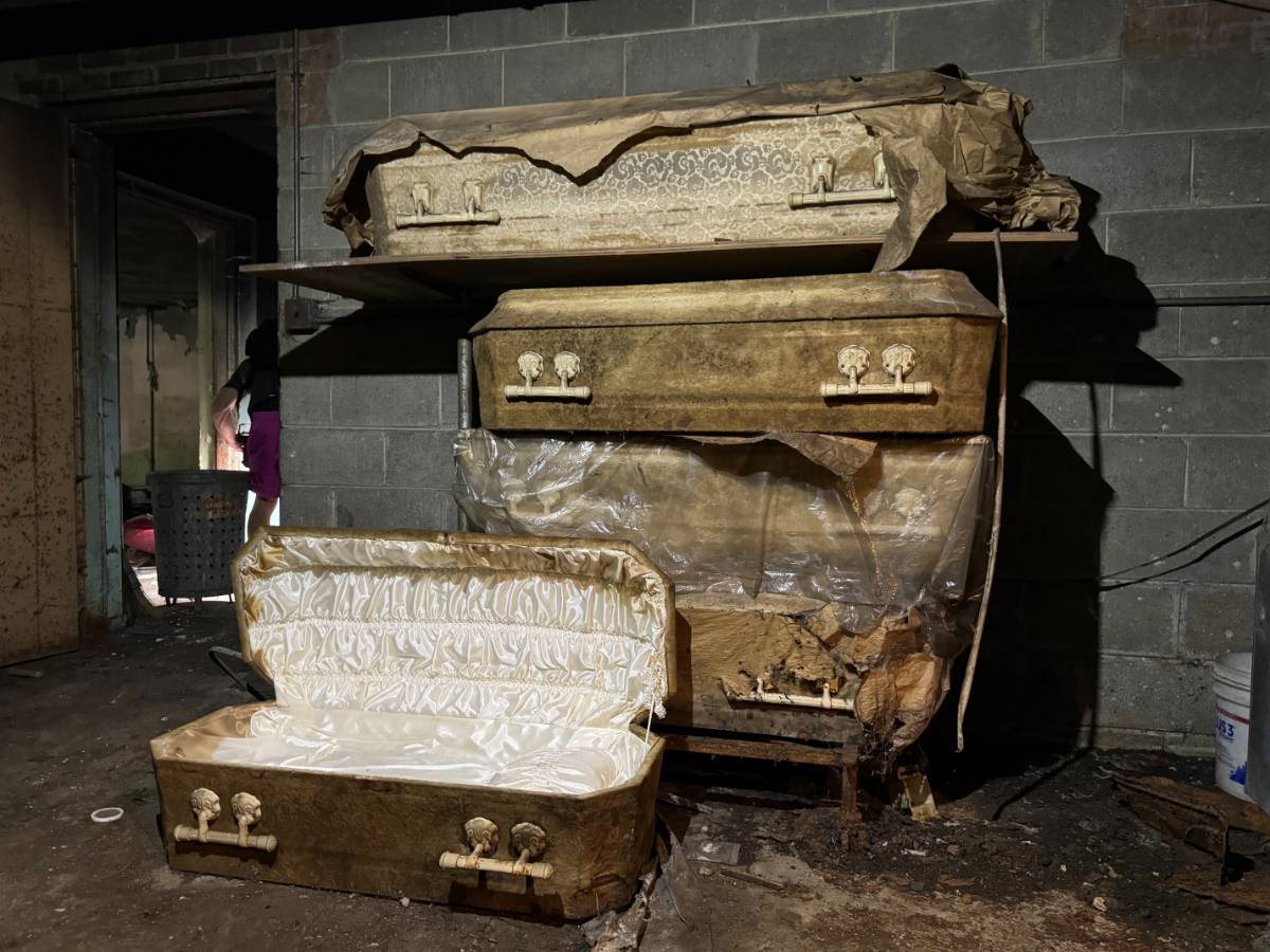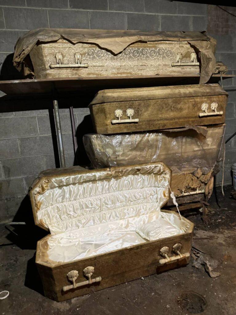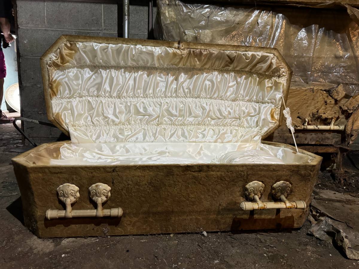 a child’s casket just tossed next to an unused bo-flex and piles of clutter and detritus