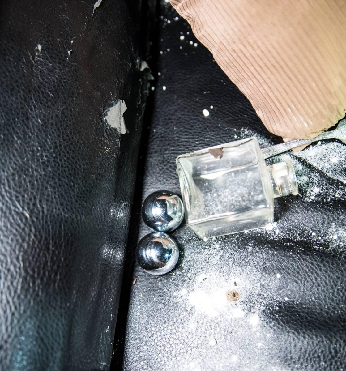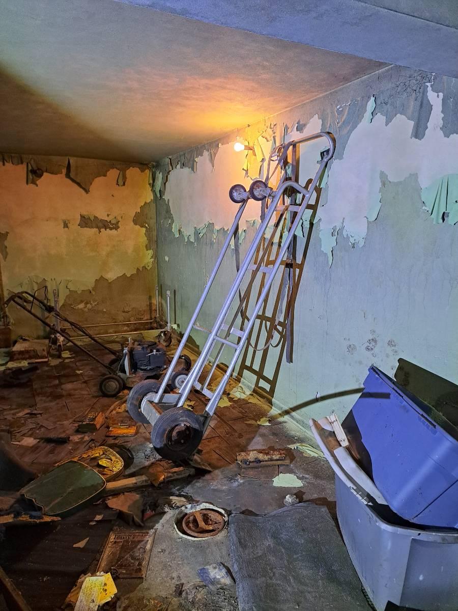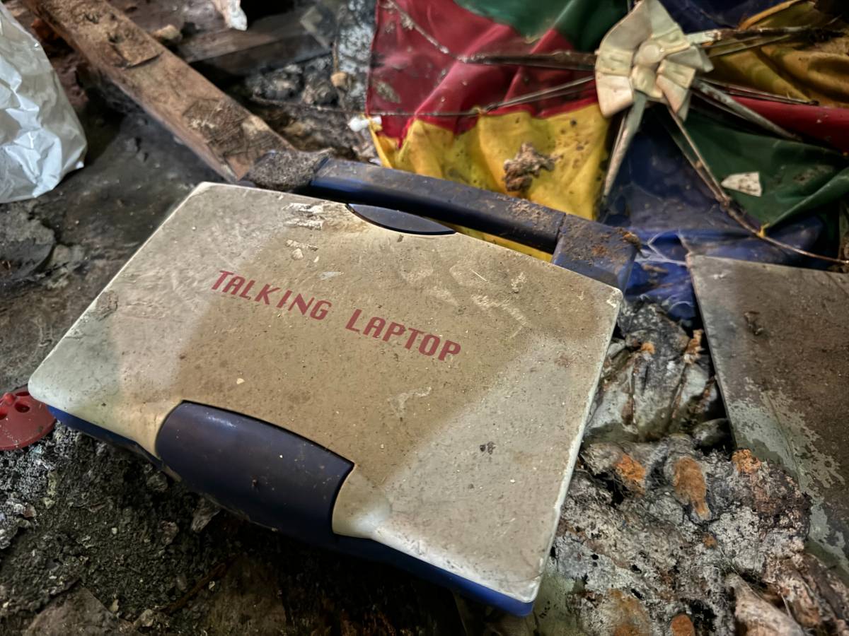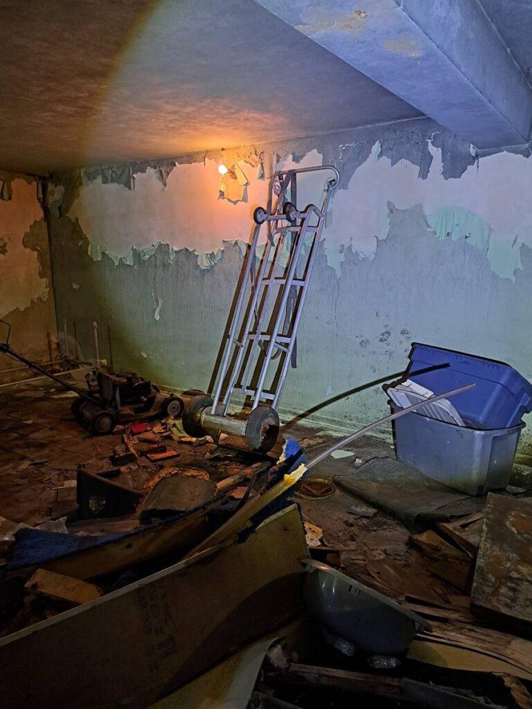 a child’s casket just tossed next to an unused bo-flex and piles of clutter and detritus