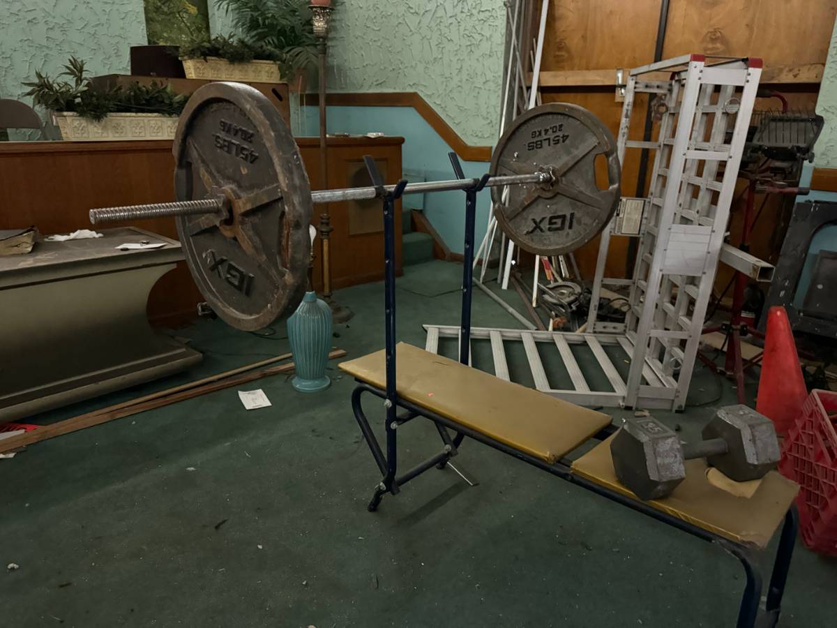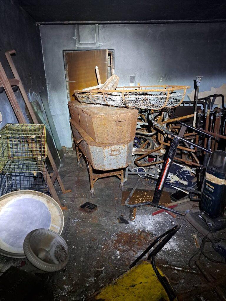 The main parlor was just as messy as the smaller ones, only somehow nicer. This clutter was mainly kept to the outer perimeter of the room. There was an old school bench press and weights set up in here too, as if someone was recently “pumping iron amongst their ancestors!”. On our first visit here, Rita and I didn’t find the lights to this main parlor, so there was an extra sense of unease from all of the long shadows “thrown” from our flashlights!