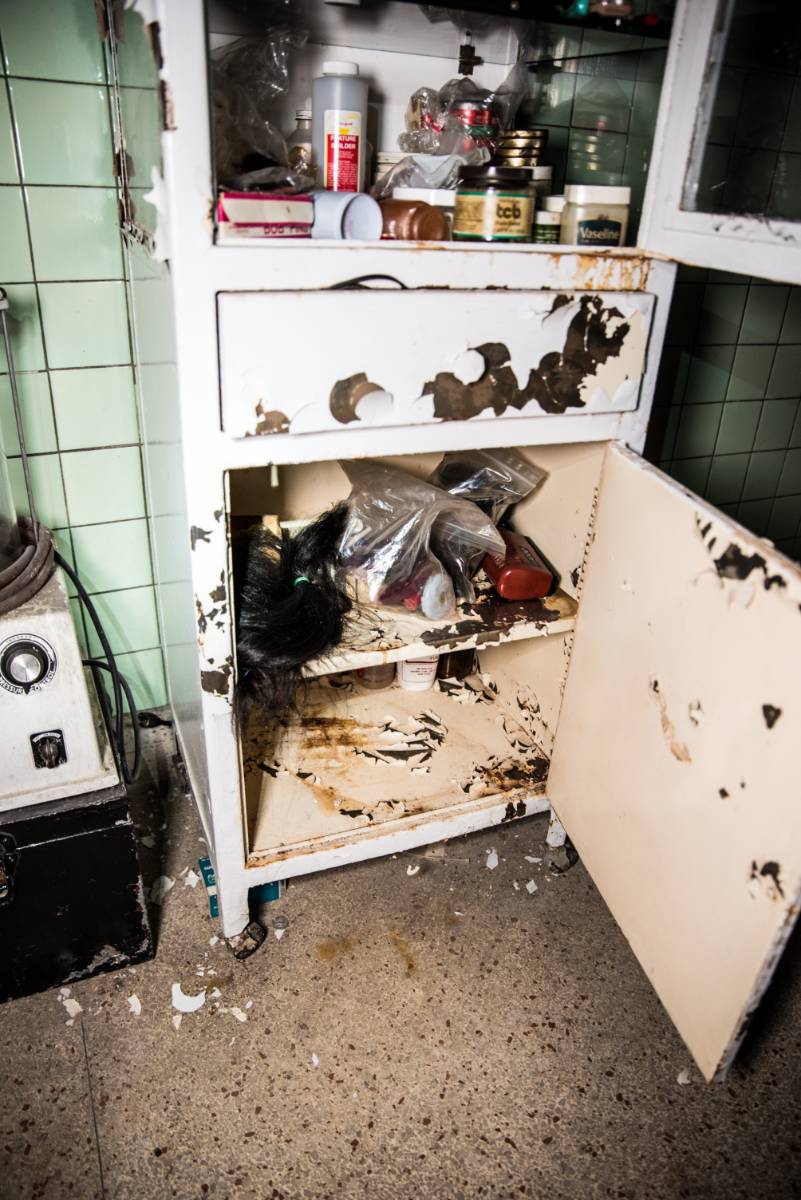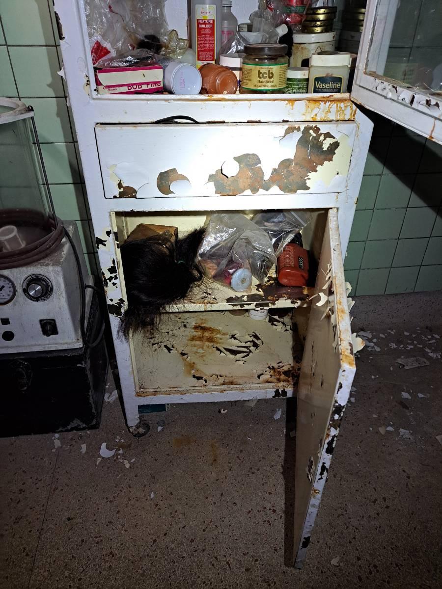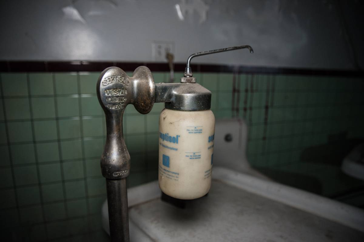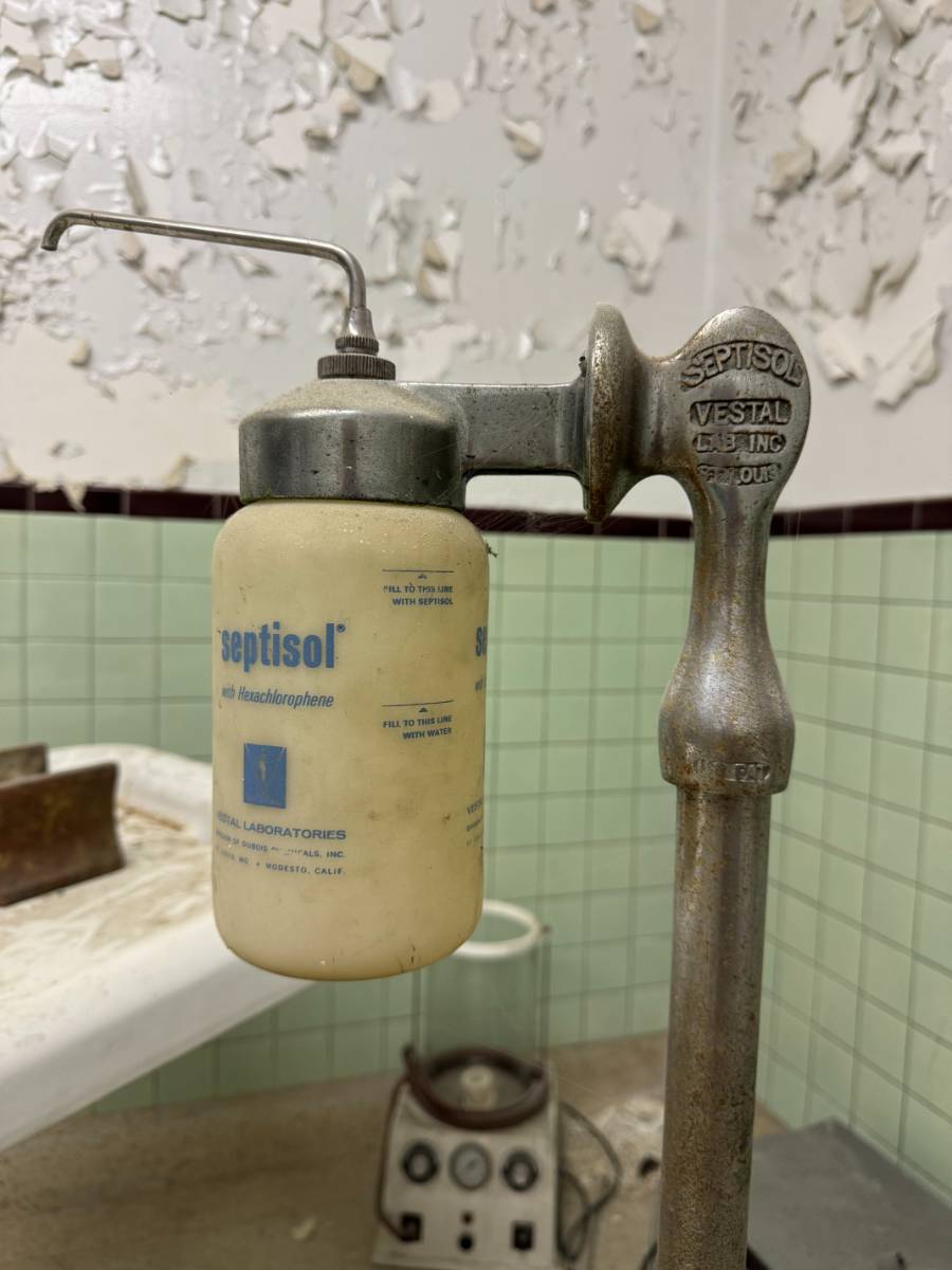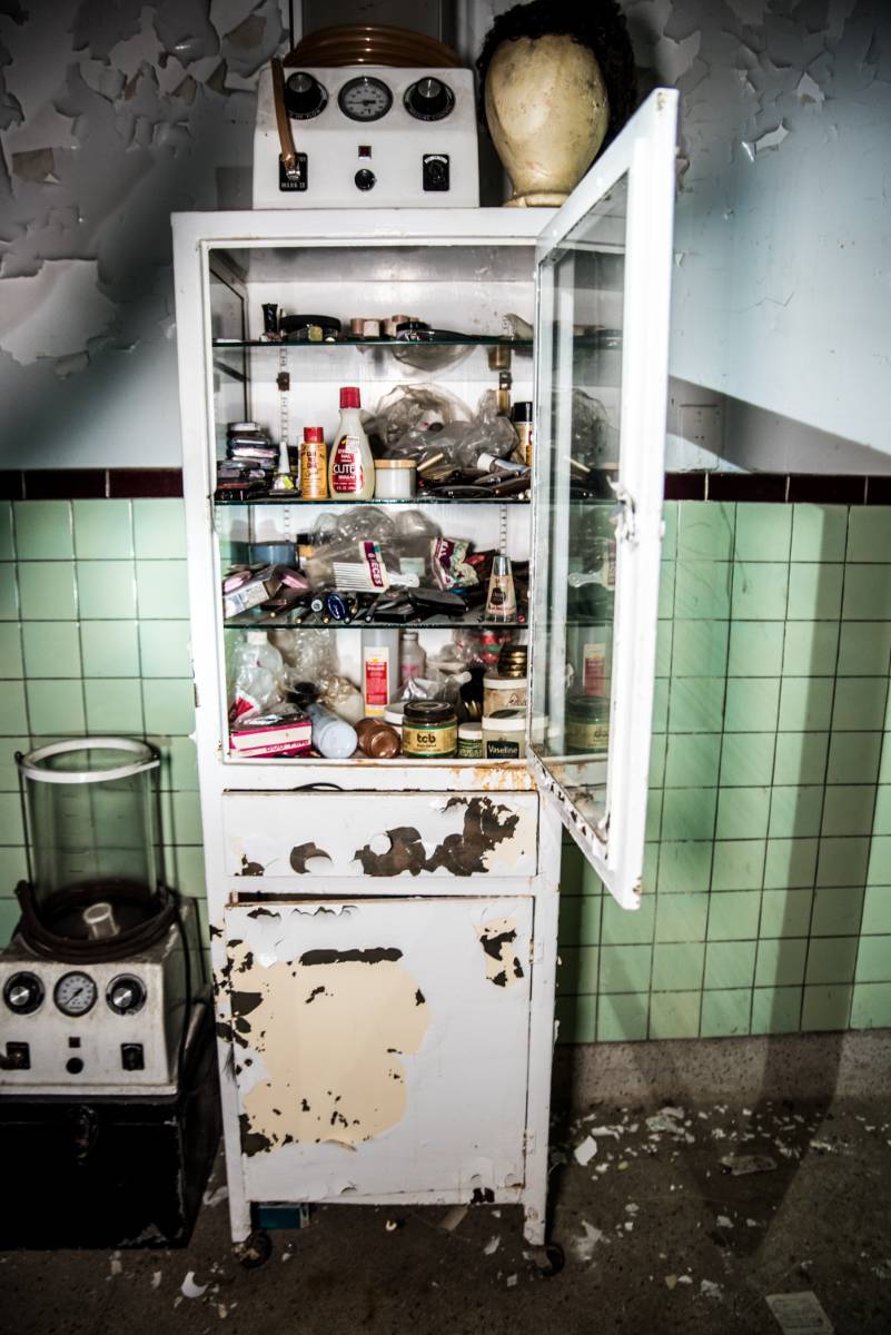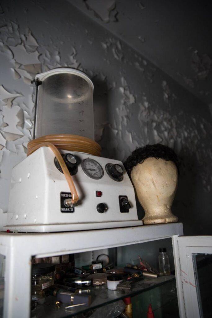 I love this full shot of the cabinet, “the wig”, and the 2 embalming pumps – extra shadows for creepy factor“Pumps-r-us”… All in the name of body preservation – to extend the time that you can viewed and not be as offensive as quickly to your loved onesnext time we whip it out…… ….. …just trash nowthis could be a movie set if it were less clutteredThe wall color in here was calmingfamily remembrance photos. Maybe they were just left behind by the families?The founder’s photo. plus cremation vaults under his piccluttered office and sound cabinetI love finding theses boards.. even semi-intact with some of the letters, they are always funquaint 1950-60s metal cabinets! calm down.. that isn’t a welcome winter… I’m surevhoping these are the Asian meditative balls, and not the other kind.dark, and creepyless gurney, more battle ready version? any ideas? email us!always a sad thoughtsad🙁ty for your servicehelloYup – a toe taga head/neck supportone last shot of “the wig” and 1 pumpStill don’t know what this is…This isn’t blood… I assure you.. It is way tooooo red in personWalking out on our 1st day, this was the layout of the room… someone rearranged it before we came back….