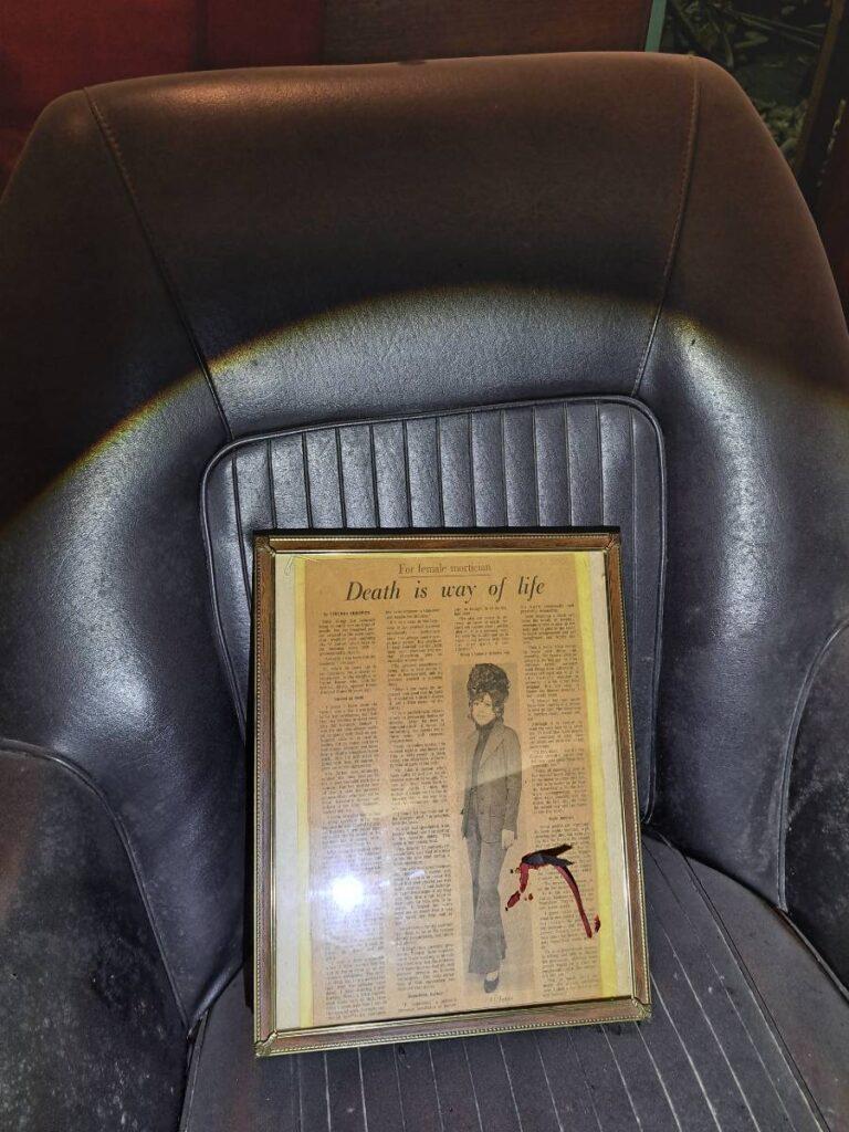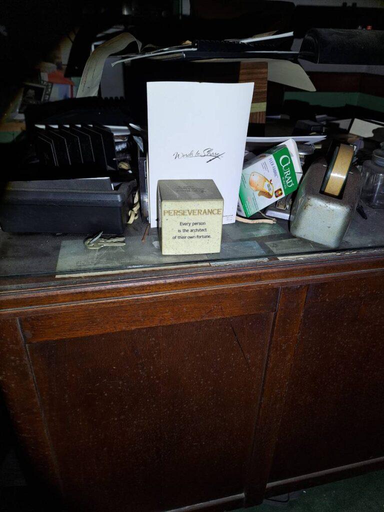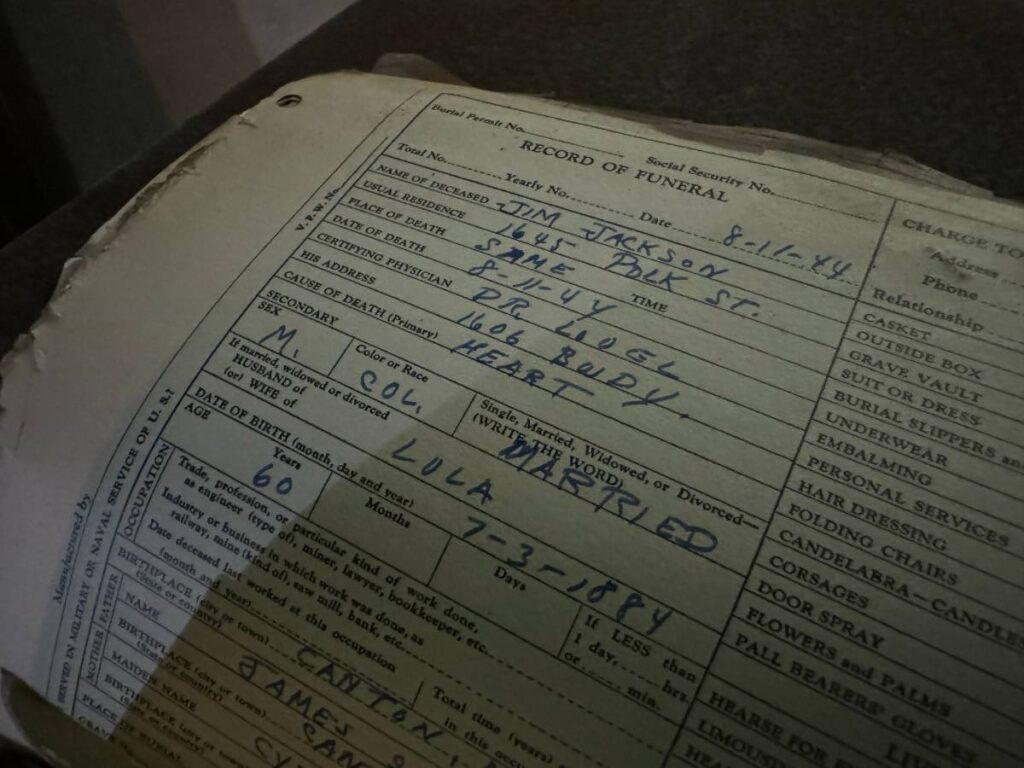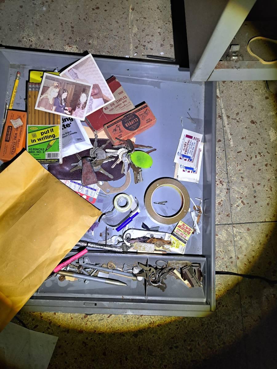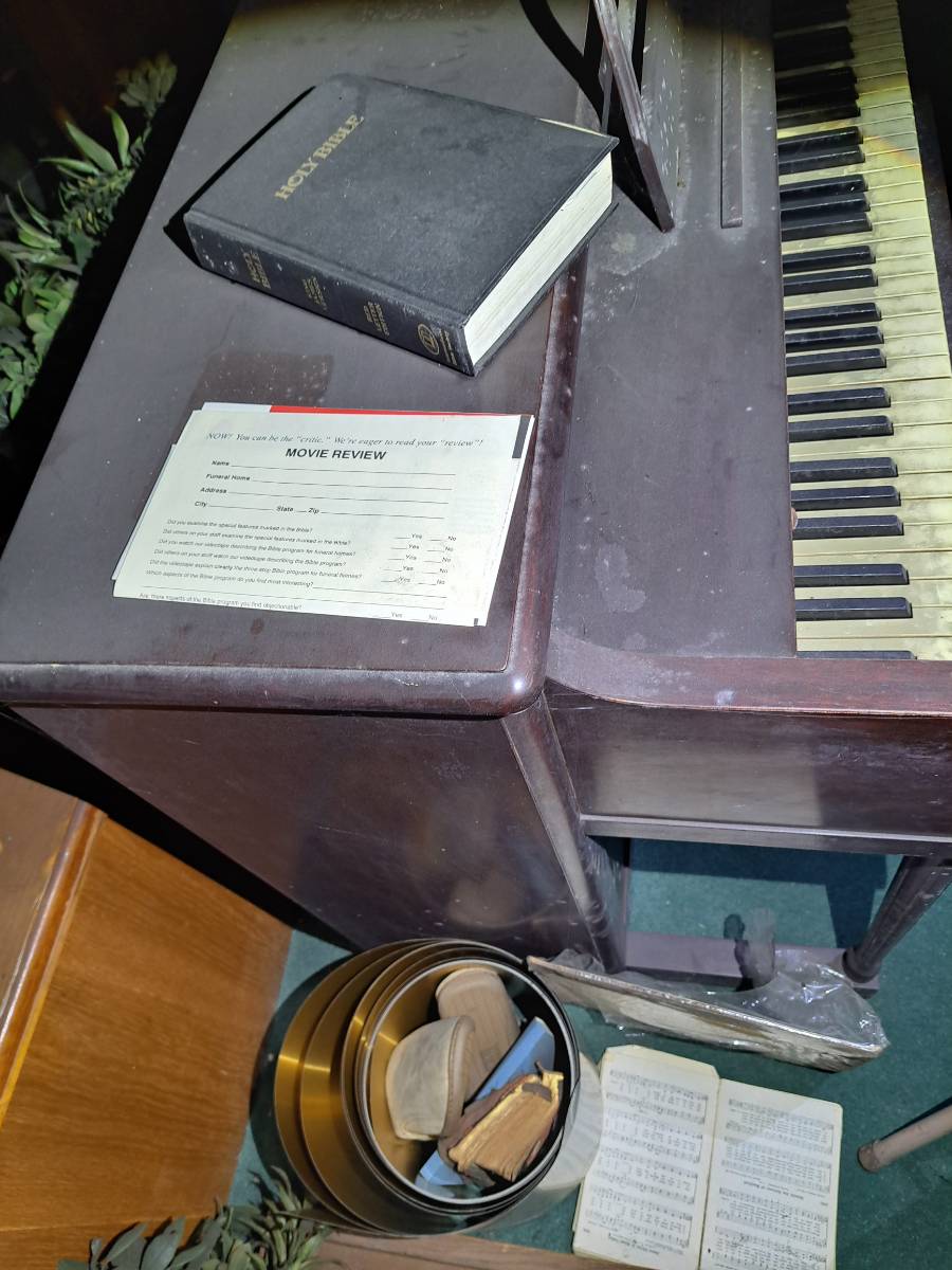 my brain didn’t register seeing this on our 1st trip here. I instantly got walking dead vibesThis reminded me of “most” TV set-ups in the late 80s early 90s. Big not working furniture TV under a smaller working tv“Here’s Johnny”…… big fan of the Shining, self promotion, or cocaine… apparently I love this “snapshot” in time. everyone had a “junk drawer” or place for clutter.. that is my entire house now :/Again, I got “bio-Shock” audio recording feelings here… even on the 2nd visit.he does save!Funeral Home Movie Review forms??? Is This A Thing?? -also the dust here told a bit of a storyI can’t tell if this room was less cluttered or more. I def. don’t remember that casket there…it most certainly wasI like itgotta buy em somewhereWe are taking bets… is that hair from the 60s, 70s, or 80s??? you decide.. Baller tho!Name plates just strewn aboutsuch a sad sad cornerMissed these entirely on our 1st trip through this site“couple of hot broads”These smiles are what I remember from this day of adventures