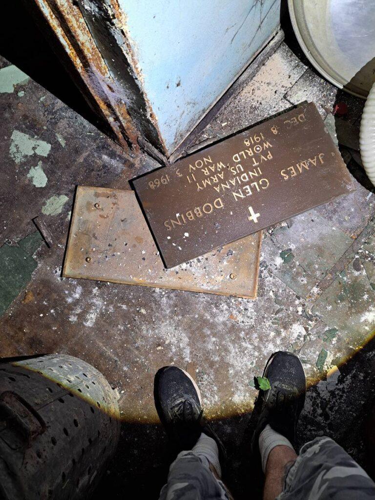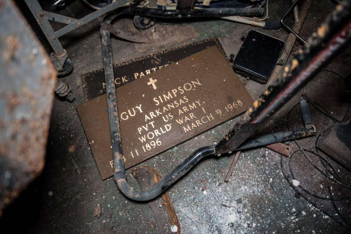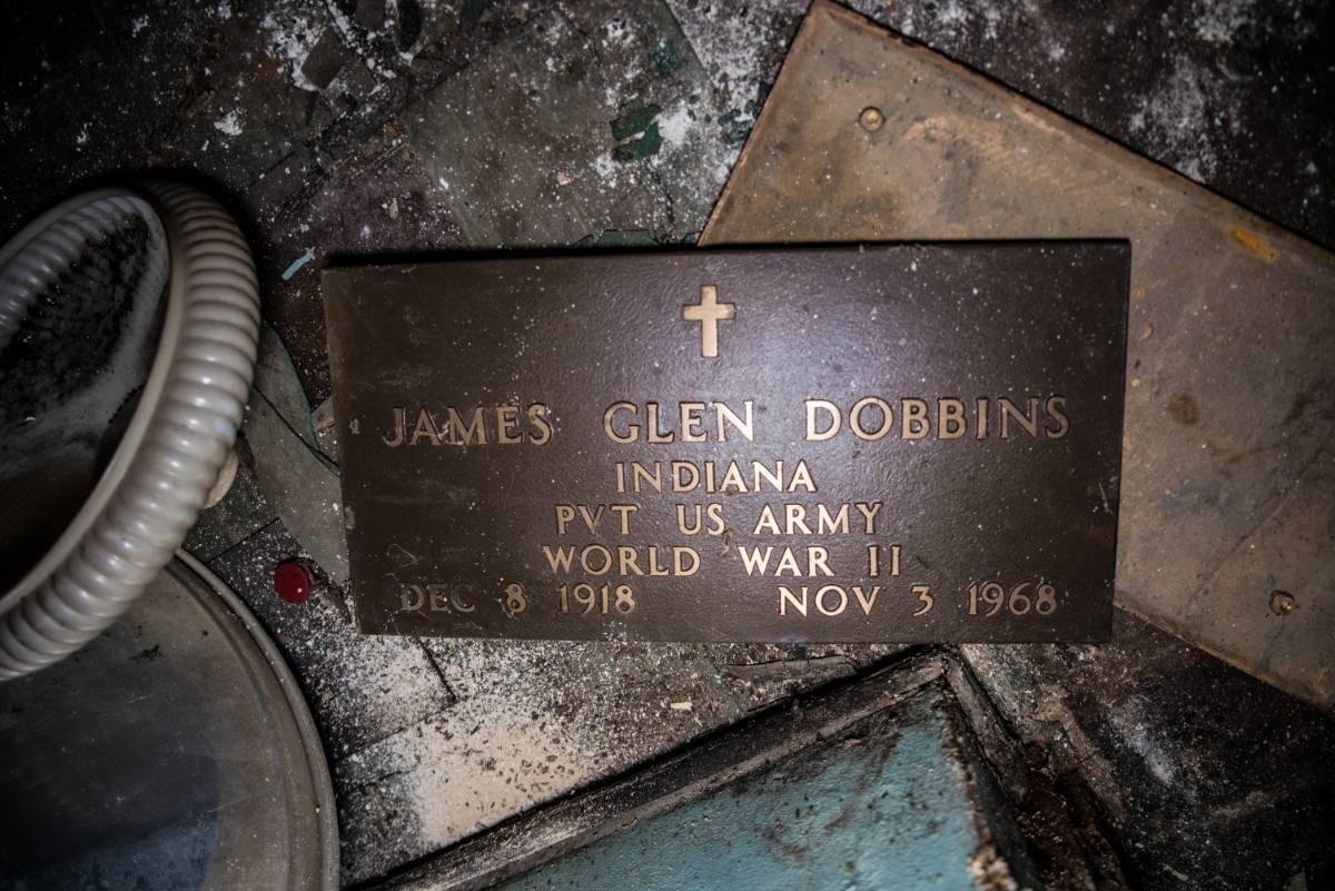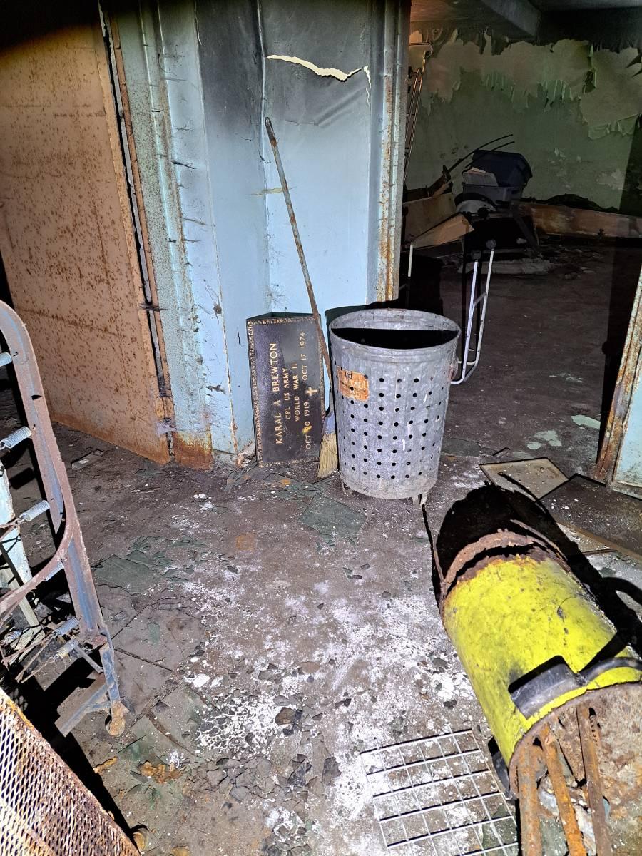 Once done upstairs, we descended the stairwell and headed towards the basement. Those stairs had been covered with a 60s/70s plastic runner, down the middle. Over time this liner had deteriorated to the point of barely hanging-on. Each step of this descent was a near disaster as the liner shifted and crumbled under our feet. Once we safely reached the basement we found all manor of funeral home items. Headstones, name placards, urns, wire gurneys, morticians carts, and even filing cabinets filled with 85(+) years of death certificates and records. Rounding the last blind corner in the basement we stumbled upon an unsettling sight. A stack of children’s caskets stood on a shelf propped against the wall. Here was another quick instance where I pondered the fleeting nature of youth and life in general… .. ..